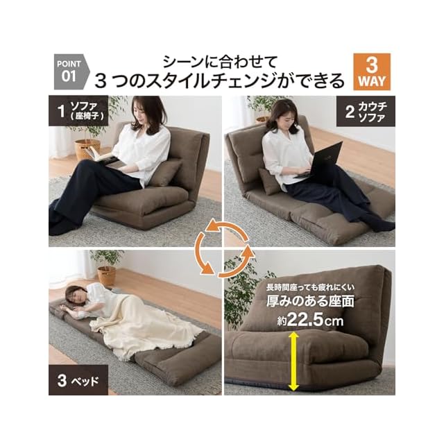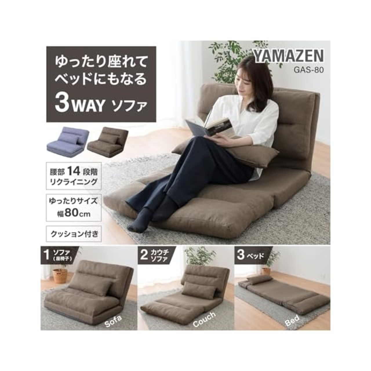 山善(YAMAZEN) ソファ ソファーベッド 座椅子 3WAY ゆったり 一人掛け クッション付き 腰部14段階 リクライニング 簡易ベッド ローソファ 幅80×奥行70/193.5×高さ13.5/57cm 一人暮らし 完成品 ブラウン GAS-80(BR)