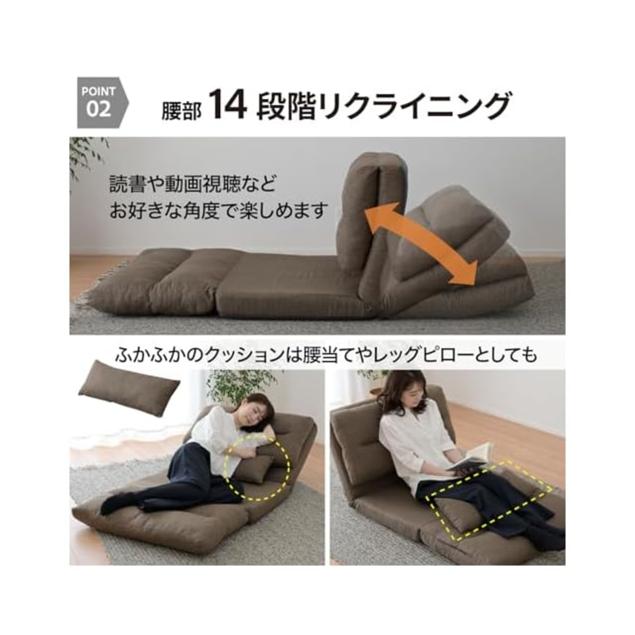 【腰部14段階リクライニング】腰部が14段階でリクライニングするので、座椅子のようにもお使いいただけます。しっかりと厚みのある座面で底付き感を感じません。