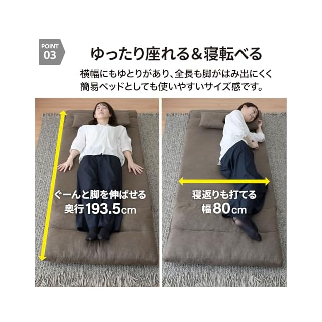 【ゆったりサイズ】幅80cmでゆったり座れるサイズ感です。広げると、ベッドとしてものびのび使える奥行193.5㎝です。
