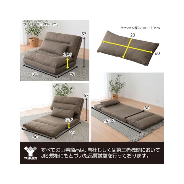 商品名:山善(YAMAZEN) ソファ ソファーベッド 座椅子 3WAY ゆったり 一人掛け クッション付き 腰部14段階 リクライニング 簡易ベッド ローソファ 幅80×奥行70/193.5×高さ13.5/57cm 一人暮らし 完成品 ブラウン GAS-80(BR)
