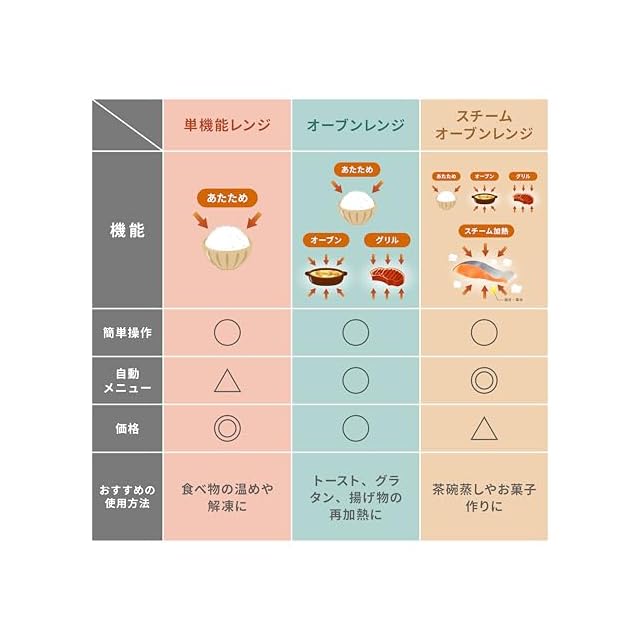 【レンジ機能】50Hz時は2段階(200W/500W)、60Hz時は3段階(200W/500W/650W)での出力切替が可能。「お弁当」「お惣菜」「解凍」などよく使う項目はメニューを選択してスタートボタンを押すだけで、温度や時間を自動で設定してあたためてくれます。※レンジ出力500W以上で15分を超えて動作した場合、出力は約350Wに自動的に切り換わります。