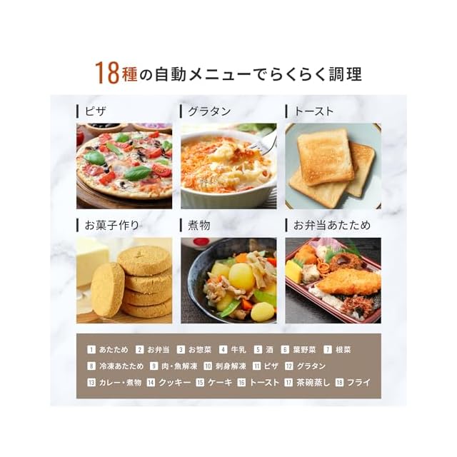 【オーブン機能】上下のヒーターの加熱を温度センサーで調整し、設定した庫内温度で焼き上げます。グラタンやピザ、クッキーにスポンジケーキなど幅広いメニューが楽しめます。また、揚げ物をサクッと温め直すのにも役立ちます。オーブン機能は35℃と40℃に設定すると発酵モードになるので、自家製パンにも挑戦できます。※設定温度220〜250℃の運転時間は約3分です。その後は自動的に約210℃に切り換わります。