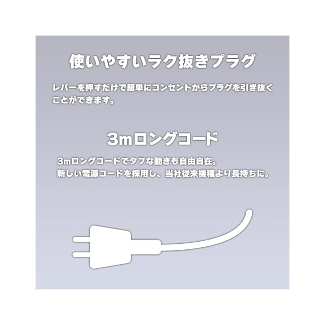 ● サロンワークに便利な3mのロングコード 。電源コード引き抜きをラクにする、ラク抜きプラグ 。コード抜き差しの多いサロンワークで大活躍。プラグのレバーを押すだけでカンタンにコンセントから引き抜くことができます。● 静電気を低減する、マイナスイオン搭載 ● クールショットスイッチで冷風もワンタッチ ● 日本製