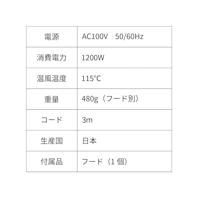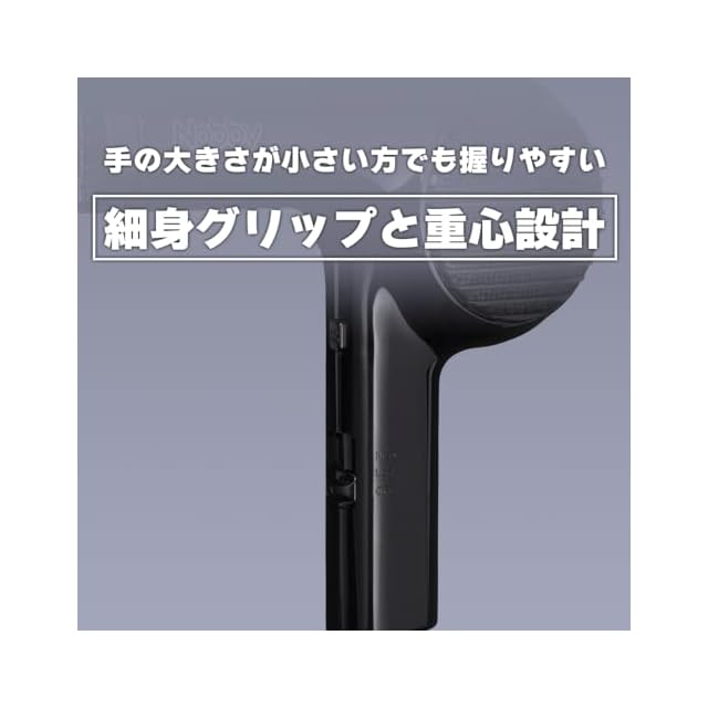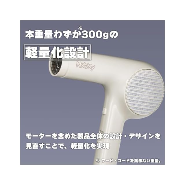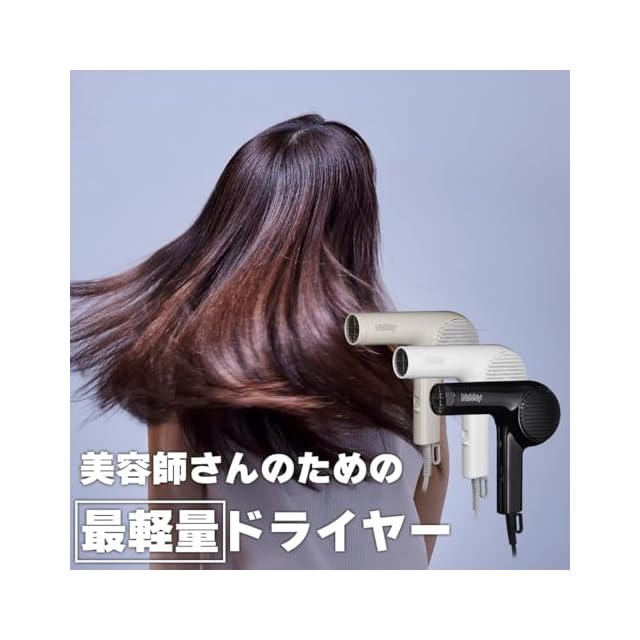 ●長時間のサロンワークでも疲れにくい、本重量わずか300g(フード・コードを含まず)の軽量化設計。モーターを含めた製品全体の設計・デザインを見直すことで、軽量化を実現 ● 手の大きさが小さい方でも握りやすい、細身グリップと重心設計。美容師さんへのリサーチを重ねて開発された新設計。ノズル持ちも使いやすい 。 ● サロンワークを効率化する、従来機種対比風速125%アップ。自社設計モーターにより、本来は難しい軽量化とパワーアップの両立を実現
