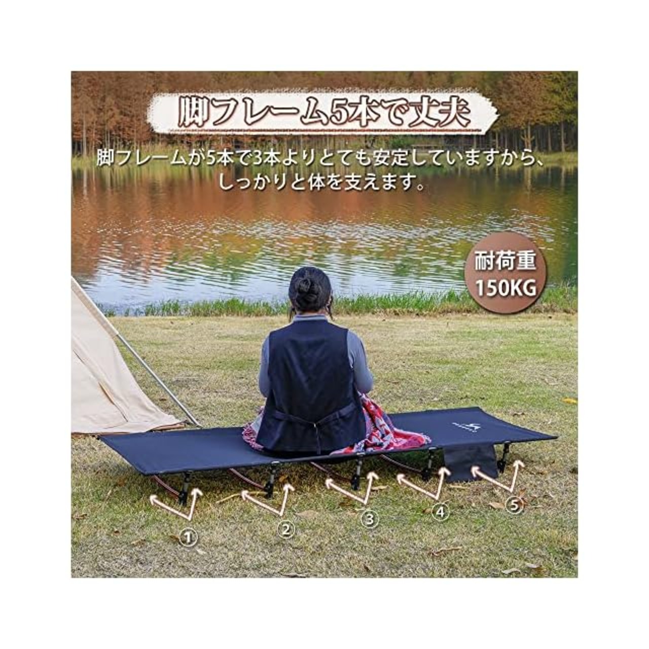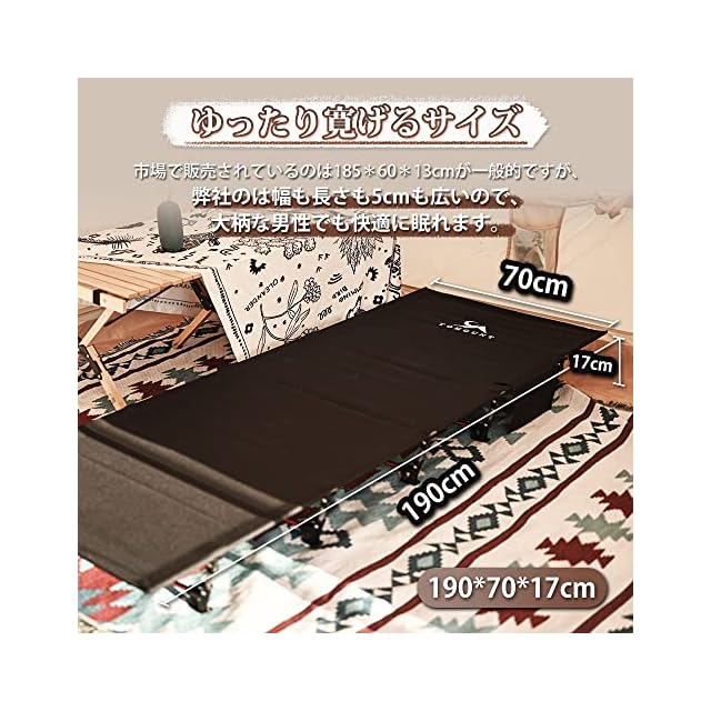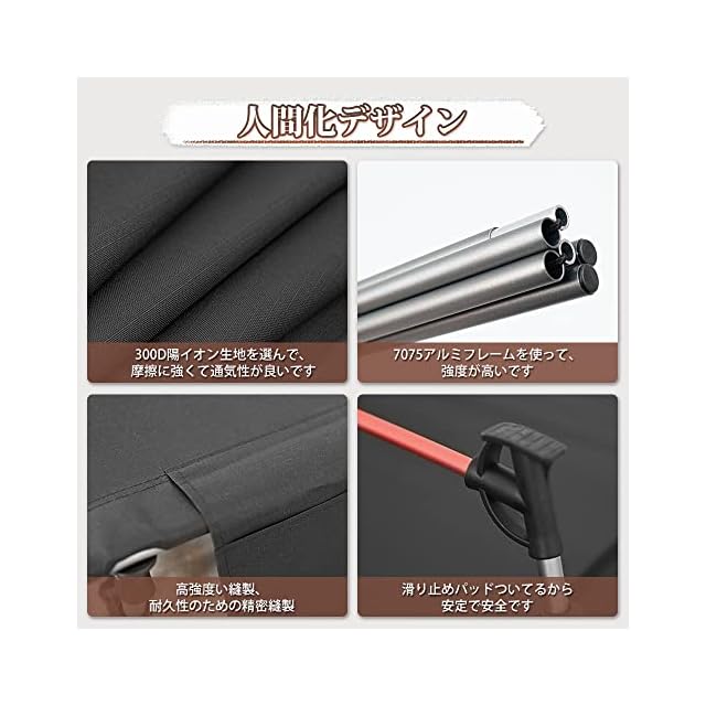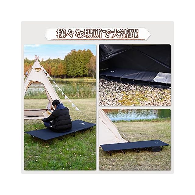 【安全で人間化デザイン】キャンプベッドの展開サイズ:約190*70cm。コットは300 Dカチオン布で作って、耐久性に優れていて、長持ちできます。フレームはA7075アルミニウム合金を採用しています。また、ベッドの下に5つのフレームがあり、低騒音で、良い休憩環境を提供します。地面から離れ、水、虫、冷えに邪魔されなく、アウトドアでもベッドの快適さを楽しむことができます。
