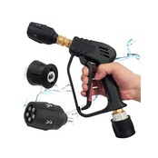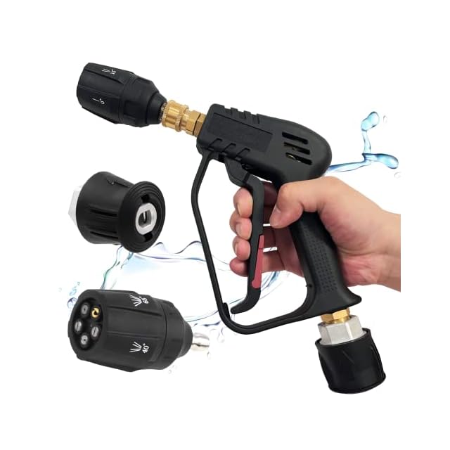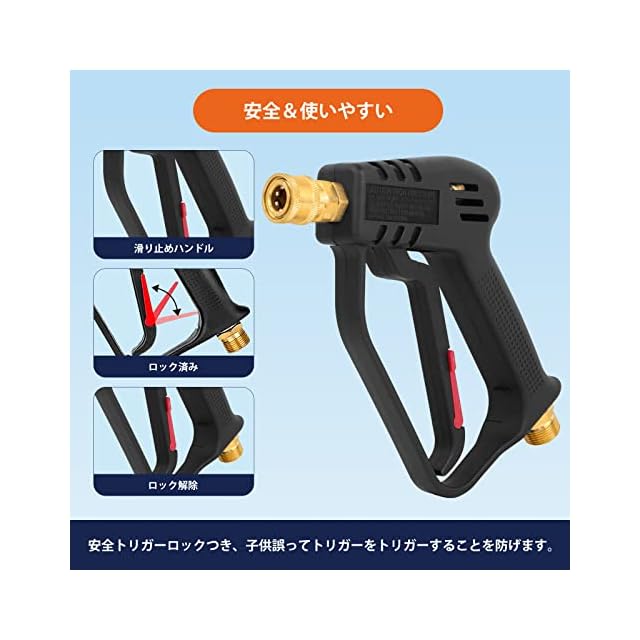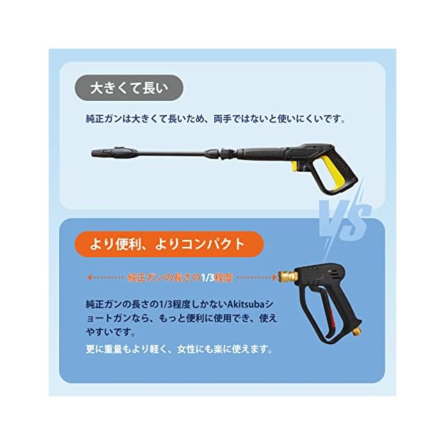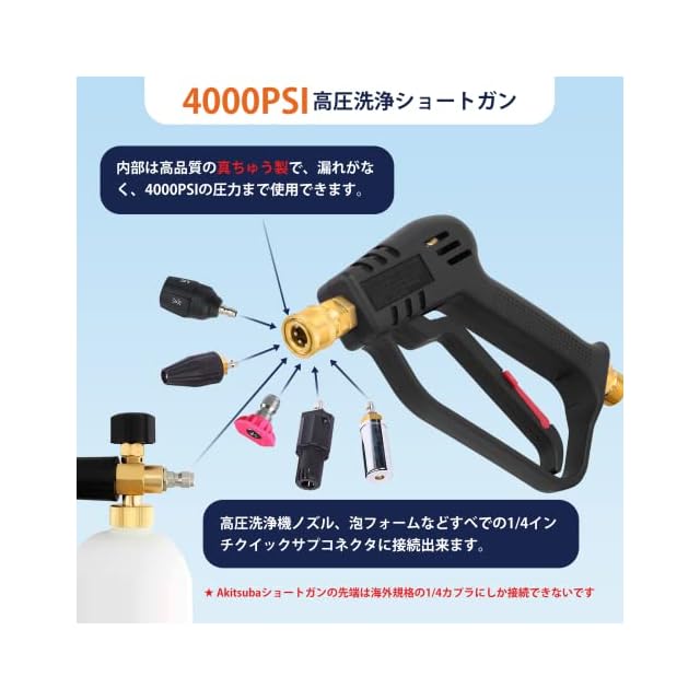 【狭い所も使えやすい高圧洗浄ショートガン】Akitsuba高圧洗浄ショートガンは、ケルヒャー(Karcher)Kシリーズに適用、元の長いガンより短く、片手で操作しやすいショートデザインを採用していますショートガンの先端は1/4インチのクイックメスインターフェースを採用、任意の1/4インチクイックサブコネクタに接続できます(海外規格のみ)ショートガンのテールはM22-14mmめねじインターフェースを採用しており、M22-14mmめねじジョイントのホースに直接接続できます狭い所にもお役に立ちます(Generac、Simpson、Briggs Stratton、Craftsman、Karcher、Ryobi圧力洗浄機などのM22-14mmホースを備えた圧力洗浄機と互換性があります) 【多機種に適性があります】Akitsuba高圧洗浄ショートガンは便利なケルヒャー(Karcher)クイックコネクトアダプターが付属しています内側は通常のアダプターはプラスチック製の製品より高品質のアルミを採用し、通常のアダプターに比べて耐久性に優れています M22-14mmめねじコネクタの一方の端は高圧洗浄ショートガンに接続でき、もう一方の端はケルヒャークイックホースに接続できますKarcher K MINI K2 K3 K4 K5 K7 JTKと互換性があり、ミュートとクラシックを接続できますご注意:クイックコネクト採用前の古い機種には接続不可OC3、KHB5、業務用HDシリーズは接続不可 【高品質素材を採用、安全トリガーロックあり】Akitsuba高圧洗浄ショートガン本体は、耐久性、耐摩耗性、耐落下性に優れたエンジニアリングプラスチック製です 内部は高品質の真ちゅう製で、漏れがなく、4000PSIの圧力まで使用できますまた、高圧洗浄機のショートガンには安全トリガーロックが付いており、偶発的なトリガーのトリガーを防ぎ、事故や怪我を防ぎます 【5段階調整クイックコネクトノズル付き】Akitsuba高圧洗浄機ショートガンセットには、5段階調整可能な1/4"クイックコネクトノズルが装備されています5つのスプレーモードで、すべての洗浄ニーズに対応します スプレーパターンには0、15、25、40、65があり、回転させることで必要な角度に調整できます(65では、水圧はシャワーのようなものであり、高圧リンスではありません)普通の単一ノズルより、交換し必要がなく、便利しか言えません更に洗浄力も従来品よりもっと強いです 【安心対策】Akitsubaはいつもお客様によりいい商品を提供できるように頑張っていますお客様にいい体験をさせれば幸うですですから、弊社は100%返金&1年より多くのお客様に高品質な製品とサービスを提供することをお約束します製品についてご不満やご質問がございましたら、お気軽にお問い合わせください 24時間以内に、誠実な姿勢と満足のいく解決策をお見せします