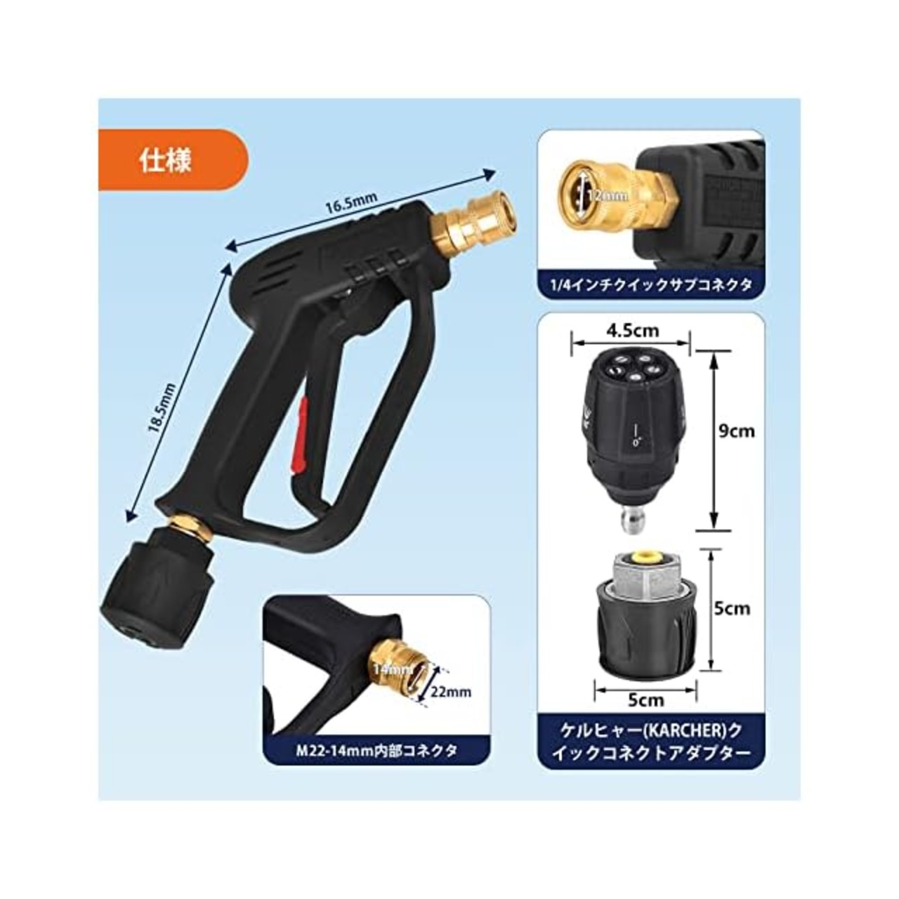 商品名:Akitsuba 高圧洗浄ショートガン ケルヒャーショートガン ショートガン 高圧洗浄ガン ケルヒャー対応 ケルヒャーノズル 4000PSI 高圧洗浄機 ケルヒャーフォームガン 洗車 ケルヒャー(Karcher)Kシリーズ K2 K3 K4 K5 K6 K7 JTKに対応 真鍮製 M22-14mmクイックコネクトアダプター 5in1ノズル(8L/min)付き (0〜65度)調整可能