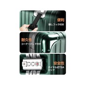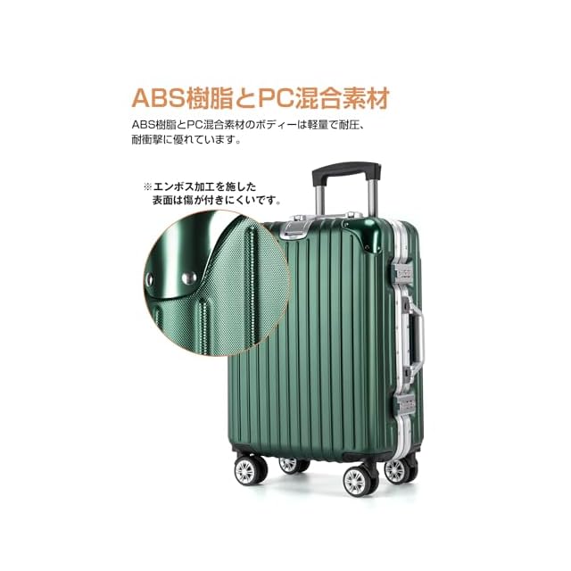 【改良されたアルミフレーム&ボディー素材】スーツケースは強化アルミフレームを採用し、従来のファスナータイプに比べ、高級感があって頑丈です。また、スーツケース本体の形状維持を強化させ、耐衝撃性と耐久性を向上させます。ボディーはABS樹脂とPCの混合素材で作られ、耐衝撃性に優れています。エンボス加工を施し、傷つきにくいです。