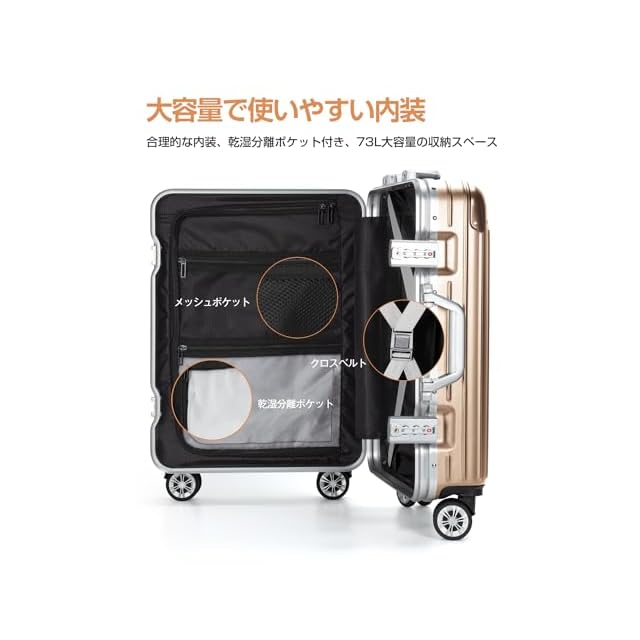 商品名:[VARNIC] スーツケース キャリーケース キャリーバッグ アルミフレーム 大型 静音 ダブルキャスター 耐衝撃 360度回転 TSAダイヤルロック 旅行 出張 (M, ゴールド)