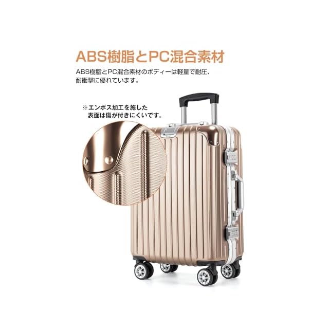 【改良されたアルミフレーム&ボディー素材】スーツケースは強化アルミフレームを採用し、従来のファスナータイプに比べ、高級感があって頑丈です。また、スーツケース本体の形状維持を強化させ、耐衝撃性と耐久性を向上させます。ボディーはABS樹脂とPCの混合素材で作られ、耐衝撃性に優れています。エンボス加工を施し、傷つきにくいです。