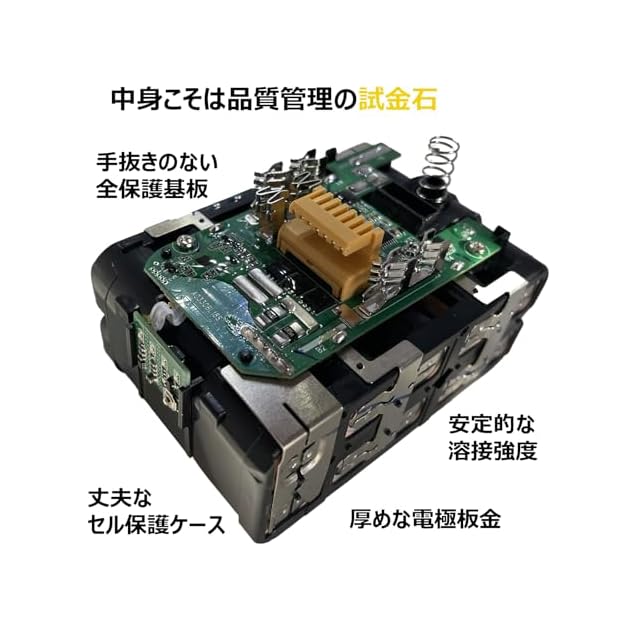 YOIbuy PROが作った18Vの互換バッテリーは、2年をかけて企画・開発されました。純正品に最も近い品質と安全性を実現するため、高品質なAグレードのセルを使用し、実容量6.0Ahと最大放電電流60Aを備えています。純正急速充電器も使用可能で、電動工具を使用するプロの方にも満足いただける高性能・高コスパの製品です。さらにYOIbuy PROは常に「安全」を第一に、バッテリーの保護機能も手抜きがありません。各セル監視する過充電、過放電保護はもちろん、充放電温度監視、短絡保護、自己放電保護機能も実装する全保護バッテリーです。 「安心」もYOIbuy PROがお客様に提供したい買い物体験です。本商品は産経省に登録済みの正規品販売品。必要な検査、検証はもちろん、メーカーとアフタサービスも心を込めて真摯に対応いたします。