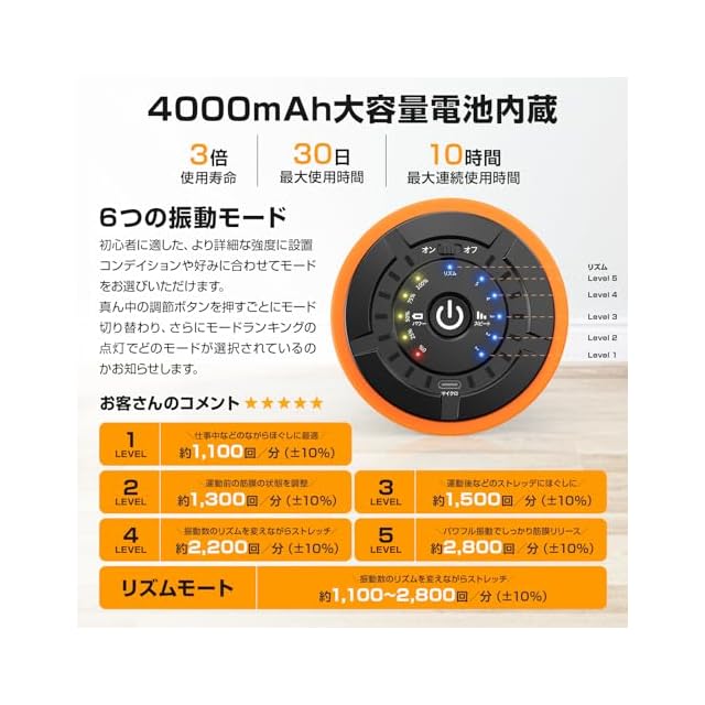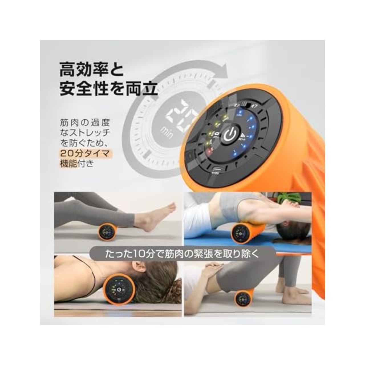 ✨【4000mAhバッテリー容量&タイマー機能付き】この筋膜ローラーには4000mAhの大容量電池が内臓で、通常のバッテリーより、使用寿命が3倍長持ちです。電動フォームローラーはUSBの充電(タイプC)だに対応、一回のフル充電でレベル1で最長24時間ご利用いただけます。さらに、筋膜ローラーを長時間使用すると筋肉に損傷可能性があるので、20分連続使用後、自動停止となる安全保護スマートセンサー搭載されています。