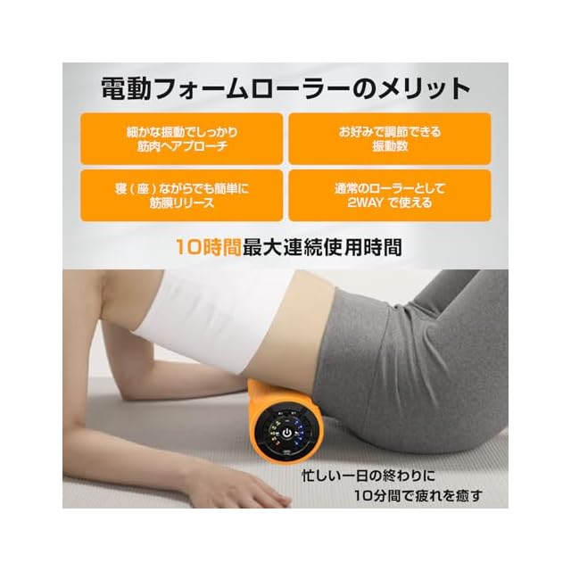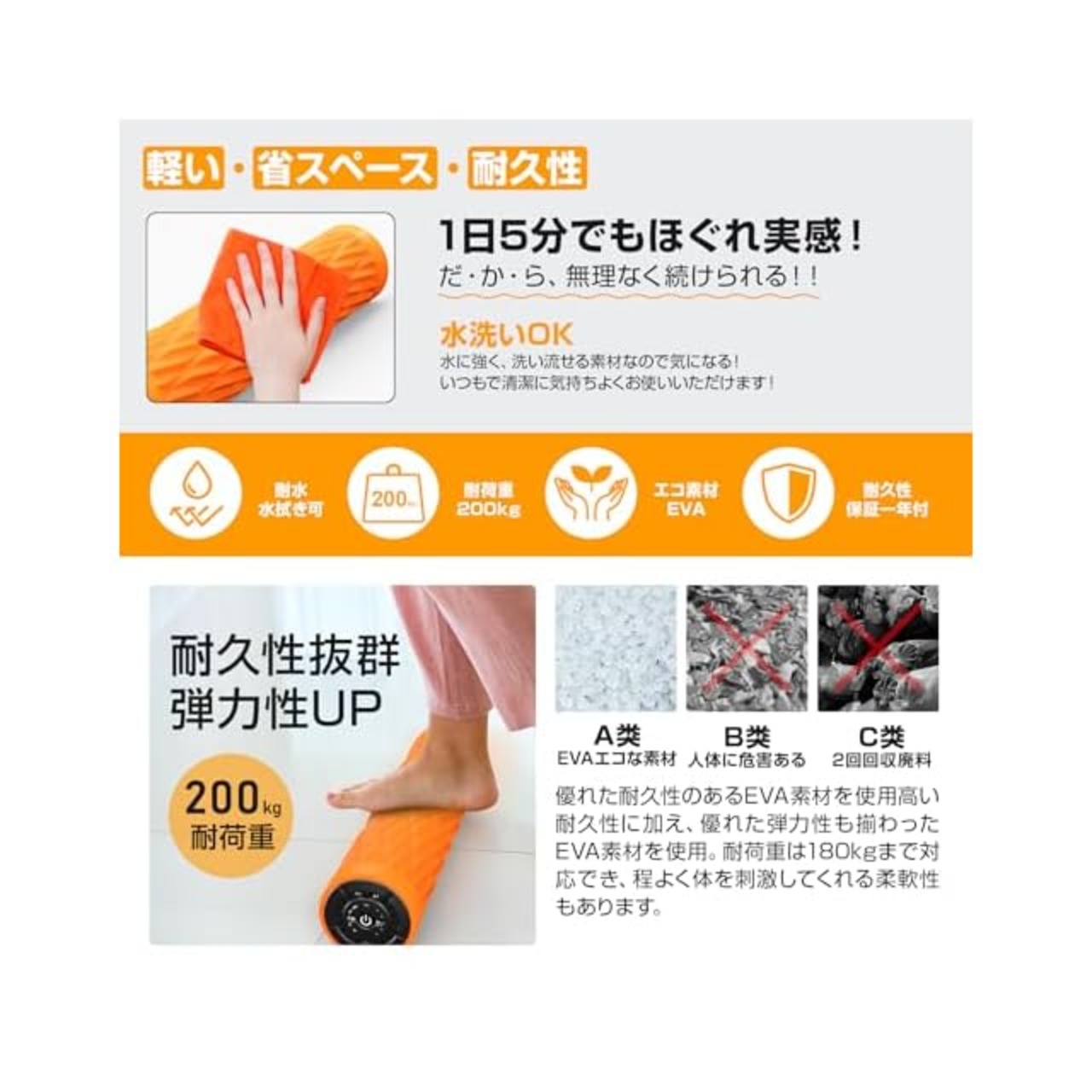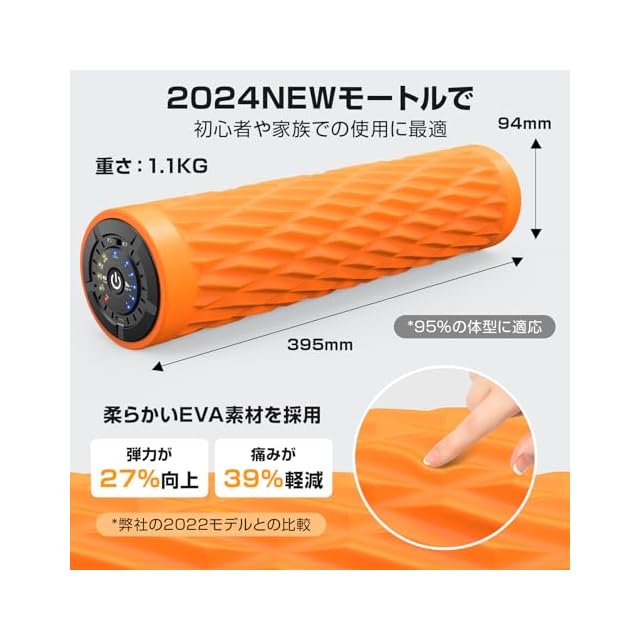 【Newモーテルで使用感UP&家族全員適用】2022年版の電動フォームローラー(筋力トレーニングに最適)に比べ、今度の新モーテル家族全員が日常生活で使用するのに適しています。 85%のお客様の使用体験をもとに、2024モーテルのサイズを変更(直径35%減、長さ20%増)し、ローラーの形状をより細長くすることで、95%の体型の方のニーズに応え、10代・ご年配の方でも使いやすくなっています。 また、より柔らかいEVA素材(伸縮性が27%アップ)を採用。※EVA 素材特有のにおいがする場合がございます。開封後、風通しの良い場所で2、3日置いておくことで軽減されます。