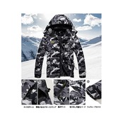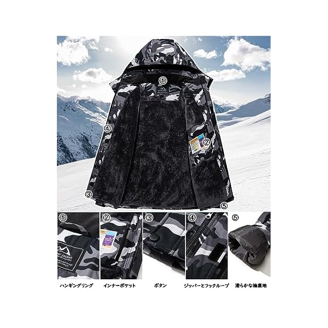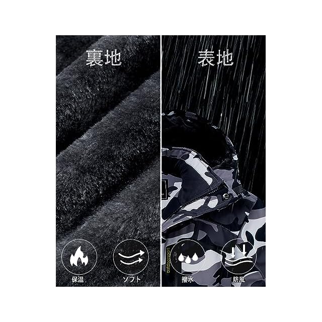 【多機能】1、撥水加工/防汚性/防風性:①防風、防水、防污のある機能性生地を採用します。②ファスナーは防水層デザインを付いて、防水性能を高めます。③ジャケットの継手の所に防水工芸を採用します。 2.防寒性/保温性:裏は裏起毛のデザインです。帽子と袖口の設計も保温性を強めます。 3.通気性/透湿性。