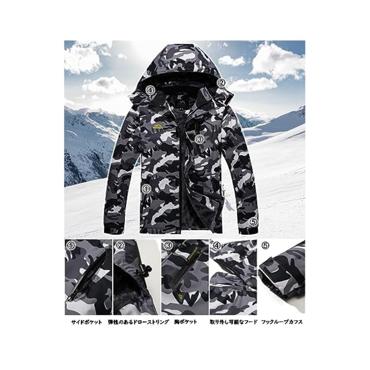 商品名:[TACVASEN] アノラック ウンテンジャケット バイク コート 釣り 保温ウエア 裏起毛 防寒 メンズ 登山服 フリース バイク用 フード付 黒迷彩 XL