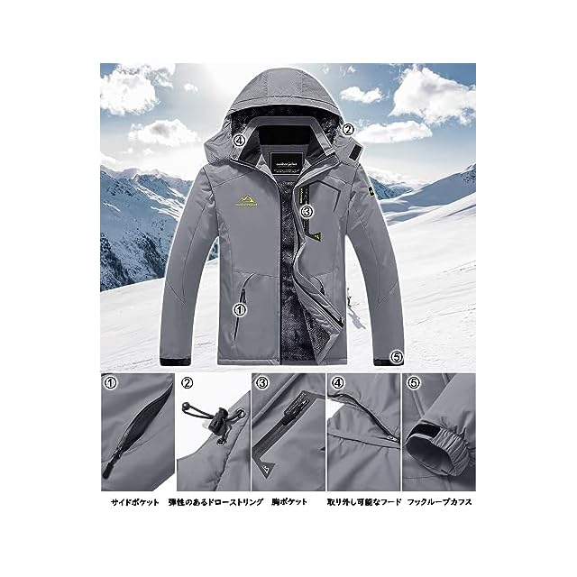【多機能】1、撥水加工/防汚性/防風性:①防風、防水、防污のある機能性生地を採用します。②ファスナーは防水層デザインを付いて、防水性能を高めます。③ジャケットの継手の所に防水工芸を採用します。 2.防寒性/保温性:裏は裏起毛のデザインです。帽子と袖口の設計も保温性を強めます。 3.通気性/透湿性。