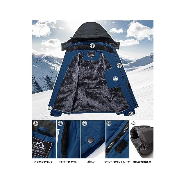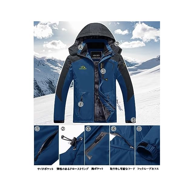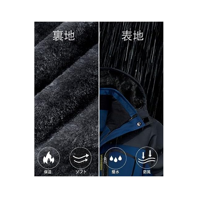 【多機能】1、撥水加工/防汚性/防風性:①防風、防水、防污のある機能性生地を採用します。②ファスナーは防水層デザインを付いて、防水性能を高めます。③ジャケットの継手の所に防水工芸を採用します。 2.防寒性/保温性:裏は裏起毛のデザインです。帽子と袖口の設計も保温性を強めます。 3.通気性/透湿性。