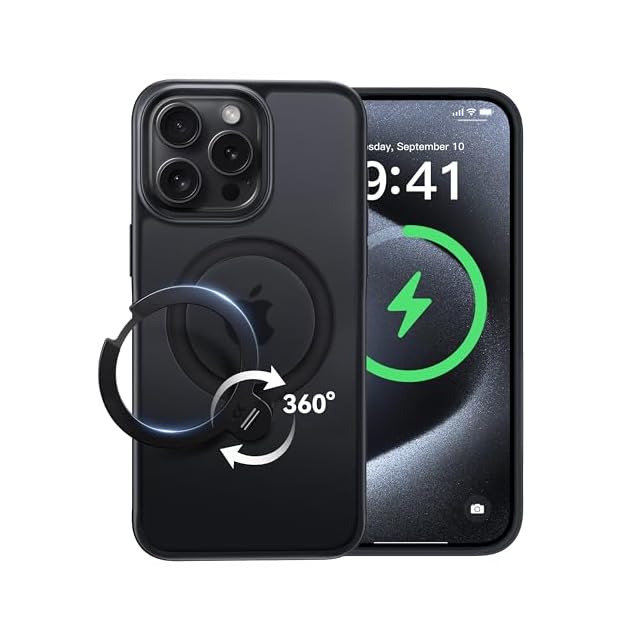 【2025最高傑作&定点360度回転】CASEKOO iPhone 15 Pro Max 用 ケース 超強磁力 米軍MIL規格 耐衝撃 高耐久性【横縦両立・角度調整】指紋防止/マット仕上げ/黄変防止/薄型半透明 ストラップホール付き ワイヤレス充電対応 アイフォン15pro max用 ケース(ブラック)