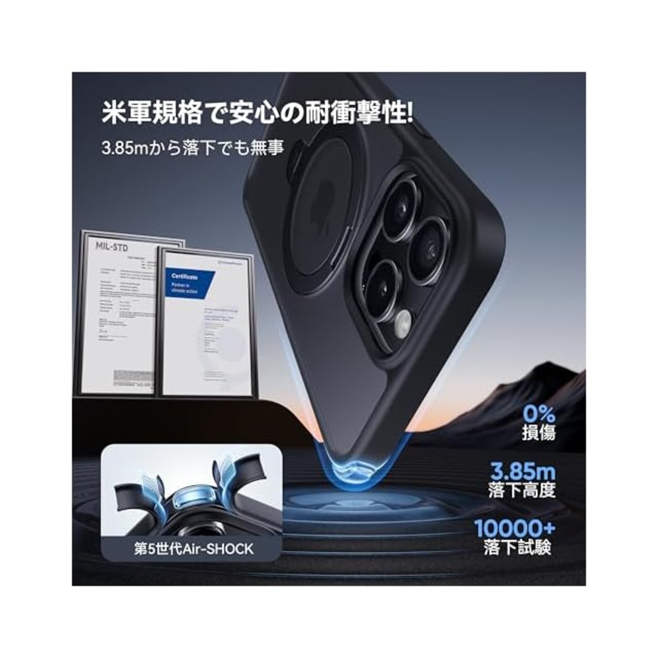【強力な耐衝撃性&落下の心配なし】硬度・耐衝撃性が’非常に高いポリカーボネート素材採用。過酷な米国国防総省の耐衝撃試験「MIL-STD-810G」認証クリアし、特別な振動低減技術と三重耐衝撃構造、ケースの四隅に独自のU-AIRクッションを搭載することにより、衝撃吸収性能を20倍アップ!どのような角度の衝撃に対しても受け止めて大切なスマホをしっかりと保護!米軍MIL規格認証番号:GZMR220702237705|認証機関:CSTC Standards Testing Center|認証時間:Jul 20, 2022