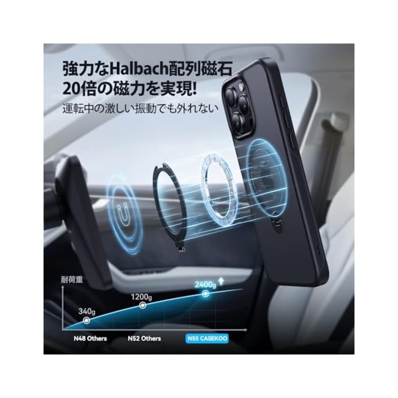 【磁力20倍!最強吸着力の両面マグネット式】MagSafeワイヤレス充電の時でも干渉しない!弊社独自のHalbach配列磁界閉鎖技術により、最大15W高速ワイヤレス充電ができ、超強力なN55磁石で吸着力は従来より20倍も高くなり、10000mAhの大容量モバイルバッテリーを付けていても簡単に落ちることはありません。MagSafe対応の車載ホルダーに装着した状態で、悪路の走行中でも落下の心配もなく快適です!さらに、両面マグネット式なので、冷蔵庫、お風呂、ジム、壁、キッチンなどの鉄部分に貼り付き、そのままハンズフリーで動画視聴も可能です。対応機種:いphone15pro maxケース
