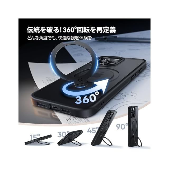 【驚くほど進化した360度回転スタンド技術】MagSafeスタンドの角度調整時の横置きの耐久性悪いと言う欠点を完璧に解消しました!弊社の最新技術によって、進化した独創的な新しい360度の回転軸を採用することによって、リングの耐久性が格段に向上し、縦の角度を0°~170°に無階段調節になり、スタンド機能をお好みの角度に調整できます。スタンドを使ってスマホを縦にしても横にしてもしっかりと支えることができます。自然な姿勢で、YouTube、映画、動画視聴やテレビ電話など楽しめます。対応機種:iPhone 15 ProMax用 ケース