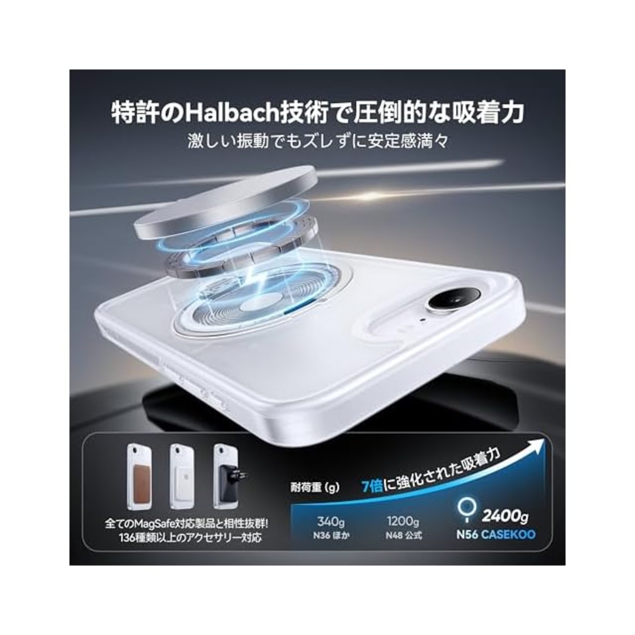 【世間を席巻したN56パワー・幅広Magsafe製品適応】スタンドに組み込まれた360度全周型のHalbach配列磁界閉鎖技術により、業界屈指の強力な磁力を実現!これにより、スマホをMagSafe対応の車載ホルダーにしっかり固定し、悪路や振動が激しい状況でズレる心配はありません。MagSafe非対応のiPhone 16eでも、このケースを装着するだけでMagSafeのような機能を実現!その圧倒的な吸着力と適応性は、ワイヤレス充電器、大容量のモバイルバッテリーなどの幅広いMagSafe対応アクセサリーと抜群の連携力を発揮し、ロッカーなどの鉄製表面にもピタッと張り付けます!対応機種:iphone 16e ケース