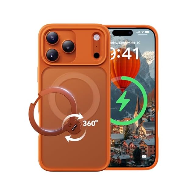 【2025最高傑作&定点360度回転】CASEKOO iPhone 17 Pro 用 ケース MagSafe対応 米軍MIL規格 360°全方向耐衝撃 【横縦両立・角度自由調整】最大25W急速充電対応 指紋防止/マット仕上げ/黄変防止/半透明 ラップホール付き ワイヤレス充電対応 いphone17pro 用ケース 6.3インチ「MagicStand Pro」(オレンジ)