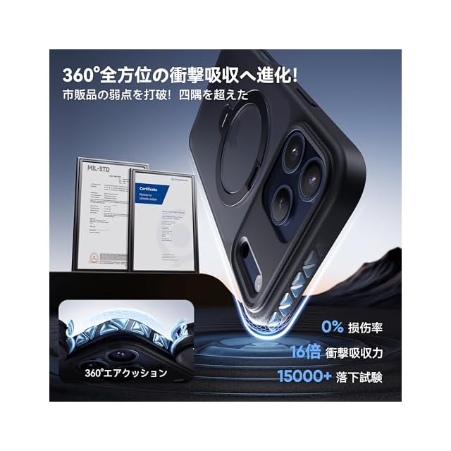 【四隅から全方向へ!進化した360°耐衝撃】 もう高額な修理代にヒヤッとしない——車から降りるとき、日常の一瞬の油断でも、市販品の弱点「四隅だけ防御」を打破!本モデルは四隅のAir-Shock 5.0+側面全体を包む360°フルカバー構造で、落下時の安心感も段違い。信頼のドイツ製素材×三層構造で、3.88m落下試験を15,000回クリア、米軍MIL規格(MIL-STD-810H)も取得済み。カメラ周囲2.5mm・画面周囲1.5mmの高低差設計と、独自の半開口カメラガードで、17シリーズの史上最大レンズを美しく、接地時の傷や摩耗からもしっかり保護。(米軍MIL認証番号:GZMR240702237705|認証機関:CSTC Standards Testing Center|認証時間:Jul 20, 2024)対応機種:iphone17 pro max ケース