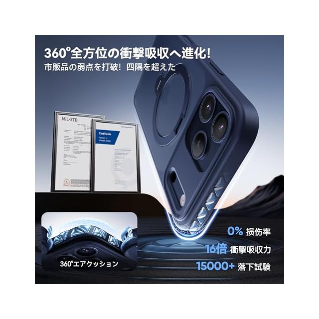 【四隅から全方向へ!進化した360°耐衝撃】 もう高額な修理代にヒヤッとしない——車から降りるとき、日常の一瞬の油断でも、市販品の弱点「四隅だけ防御」を打破!本モデルは四隅のAir-Shock 5.0+側面全体を包む360°フルカバー構造で、落下時の安心感も段違い。信頼のドイツ製素材×三層構造で、3.88m落下試験を15,000回クリア、米軍MIL規格(MIL-STD-810H)も取得済み。カメラ周囲2.5mm・画面周囲1.5mmの高低差設計と、独自の半開口カメラガードで、17シリーズの史上最大レンズを美しく、接地時の傷や摩耗からもしっかり保護。(米軍MIL認証番号:GZMR240702237705|認証機関:CSTC Standards Testing Center|認証時間:Jul 20, 2024)対応機種:iphone17 pro max ケース