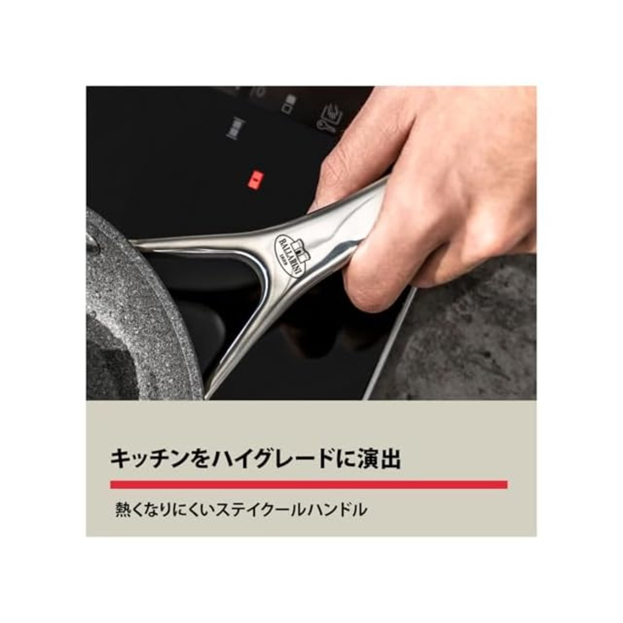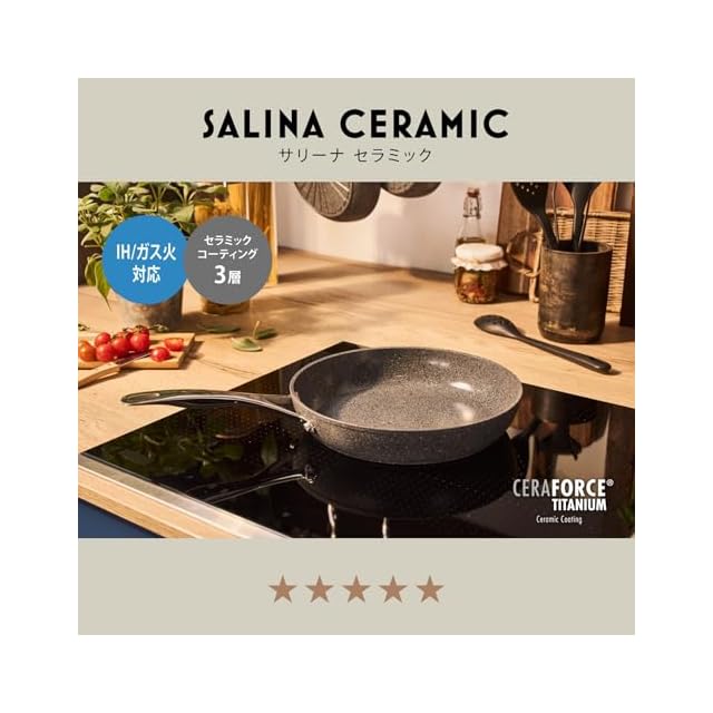 【こびりつきにくく、耐久性5倍※】バッラリーニ独自の《セラフォース・チタニウム・コーティング》を採用。2層セラミックにチタン層を加えた3層構造で、従来のコーティングより耐久性が約5倍※に向上。こびりつきにくさとツルッとした快適さが長持ちします。(※耐久性5倍は社内テストに基づく数値です。)