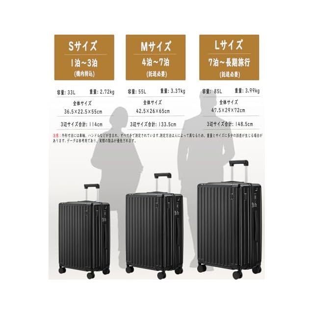 【サイズ】Sサイズの外寸は55*36.5*22.5cm、重さ:2.72kg 超軽容量、は33リットル、1~3泊に似合います。Sサイズは3辺全長114cmで機内持ち込み可能です。Mサイズの外寸は65*42.5*26cm、3辺の合計は133.5cmです、重さ:3.37kg 、容量は55リットル、4~7泊以上。Lサイズの外寸は72*47.5*29cm、3辺の合計は148.5cmです、重さ:3.99kg、 容量は85リットル、7泊以上。
