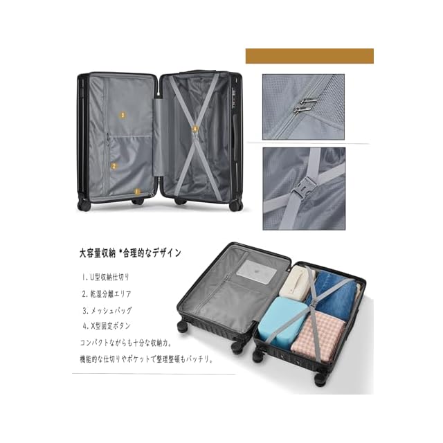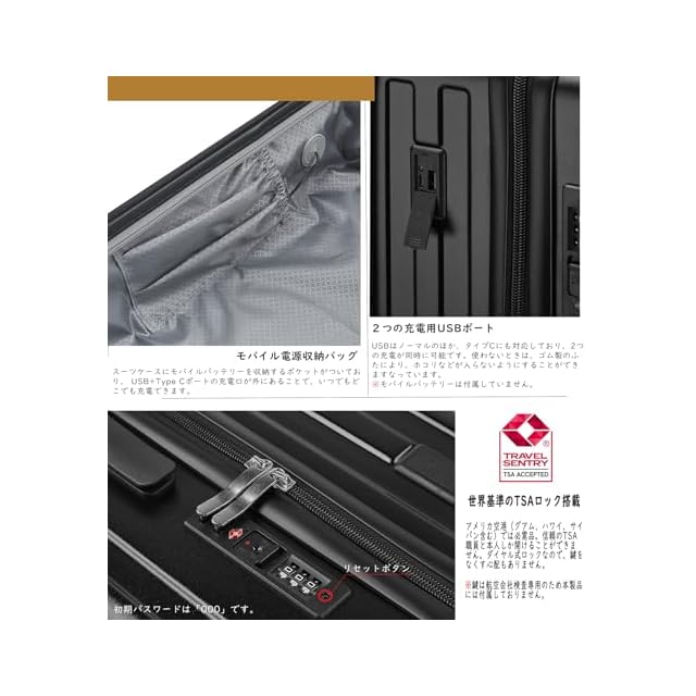 「キャスターストッパー機能」移動中の揺れにも対応するストッパー機能で、電車やバスの中でもしっかりと自立し、安全で便利な使用が可能です。また、ストッパーはワンタッチで解除できるため、乗降や移動の再開もスムーズです。<br><br> 「卓越の耐久性・衝撃吸収プロテクション」このスーツケースは、ABS樹脂とPC(ポリカーボネート)を融合させたハイブリッド素材を採用しています。三層構造のデザインにより、軽量化を実現しながら優れた耐久性を発揮。旅行中の衝撃や負荷から大切な荷物をしっかりと守ります。<br><br> 「折りたたみ式ドリンクホルダー」コーヒーカップや水筒、傘などをしっかりと固定できる折りたたみ式ドリンクホルダーが搭載されており、旅行中の利便性が向上します。<br><br> 「スマホホルダー付きレバー」レバーの上部にスマホホルダーが設置されているため、フライトの待ち時間や移動中に両手が自由になり、動画視聴や読書を快適に楽しめます。多段階調整で、自分に合った高さに調整できます。<br><br> 「USB+Type-C充電ポート」スーツケース内部にはモバイルバッテリー用の専用ポケットがあり、外部にはUSBとType-C充電ポートが装備されています。どこでも手軽にデバイスの充電が可能です。充電方法: スーツケース内のUSBケーブルをモバイルバッテリーの出力端子(OUTPUT)に接続してください。(入力端子(INPUT)には接続しないでください)。その後、ご自身のケーブルを使用してスマートフォンや他の電子機器をスーツケース側面の充電ポートに接続することで、デバイスの充電が可能です。*(モバイル電源は製品リストに含まれていないため、自分で用意する必要があることに注意してください。) <br><br> 「サイズ」Sサイズの外寸は55*36.5*22.5cm、重さ:2.72kg 超軽容量、は33リットル、1~3泊に似合います。Sサイズは3辺全長114cmで機内持ち込み可能です。Mサイズの外寸は65*42.5*26cm、3辺の合計は133.5cmです、重さ:3.37kg 、容量は55リットル、4~7泊以上。Lサイズの外寸は72*47.5*29cm、3辺の合計は148.5cmです、重さ:3.99kg、 容量は85リットル、7泊以上。