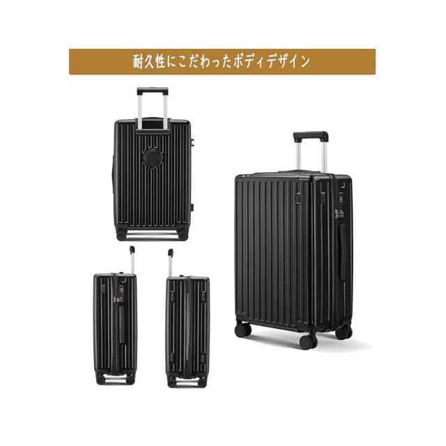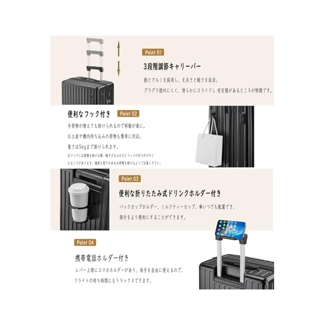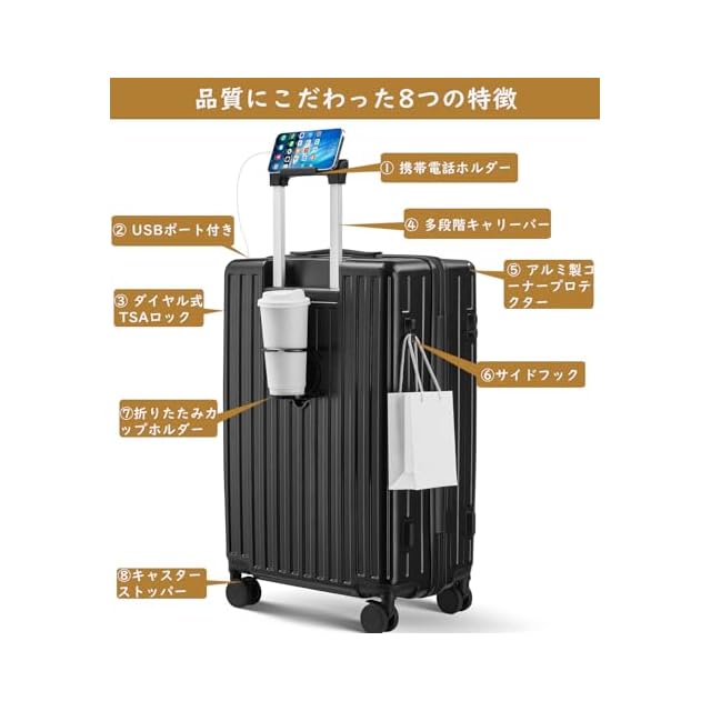 商品名:[Aecall] スーツケース 機内持ち込み キャリーケース ストッパー付き 超軽量 USBポート付き カップホルダー付き 携帯スタンド 隠しフック機能 キャリーバッグ 耐衝撃 静音 ダブルキャスター TSAローク ファスナータイプ キャリーバッグ 人気 おしゃれ 旅行 ビジネス 出張 留学 (ブラック, Mサイズ/4~7泊/託送必要)