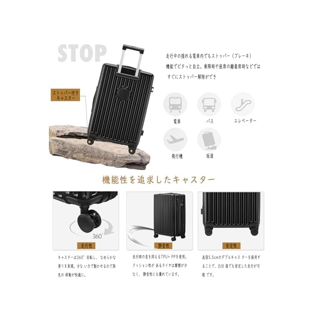 【キャスターストッパー機能】移動中の揺れにも対応するストッパー機能で、電車やバスの中でもしっかりと自立し、安全で便利な使用が可能です。また、ストッパーはワンタッチで解除できるため、乗降や移動の再開もスムーズです。サイドフック付き、モノ掛けで旅行が楽々、とっても便利で手荷物が増えたに対応します。