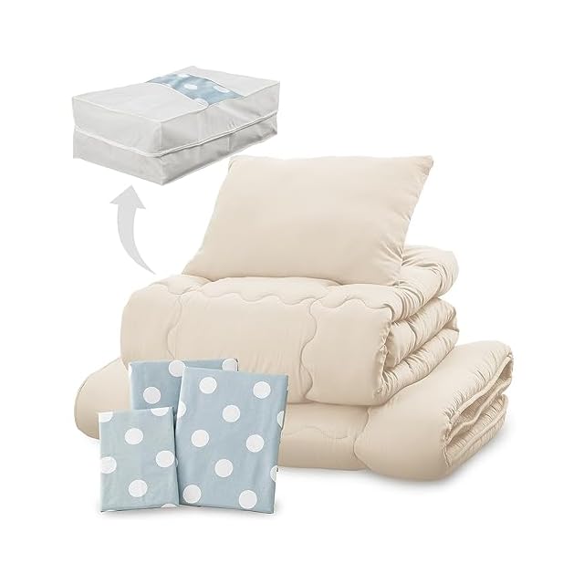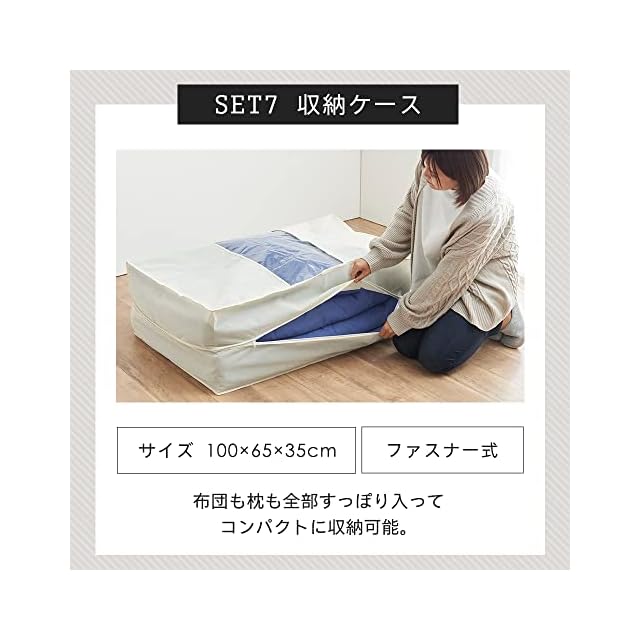 商品サイズ(約cm):【シングルサイズ】掛け布団/幅150x奥行210、敷布団/幅100x奥行200、枕/幅43x奥行63、掛け布団カバー/幅150x奥行210、敷布団カバー/幅110x奥行210、枕カバー/幅43x奥行63、収納袋/幅100×奥行65×高さ35