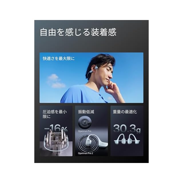 最適化されたフィット感:OpenRun Pro 2は、厳しい環境でも安心してご使用いただけるようにデザインされています。人間工学に基づいたイヤーフックと一体型フレームが、ずれることなく安全で快適なフィット感を実現します。圧力を均等に分散する広めの接触面と洗練されたバンド設計により、長時間の使用でも心地よさが持続し、プレイリストのように快適な着け心地が続きます。