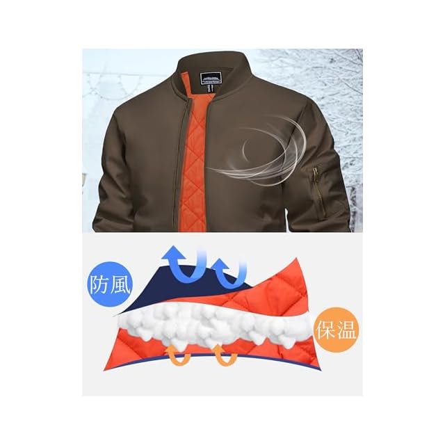 【優れた防風性・防寒性】詰め物付きなので、着た瞬間から温もりを与えてくれます。襟・袖口・裾は伸縮性のあるリブ切替、動きやすくて、有効的に風の侵入を防ぎます。また、適度な光沢感と快適な着心地を両立した大人なポリエステル生地を採用、柔かくて、通気性も揃えっています。