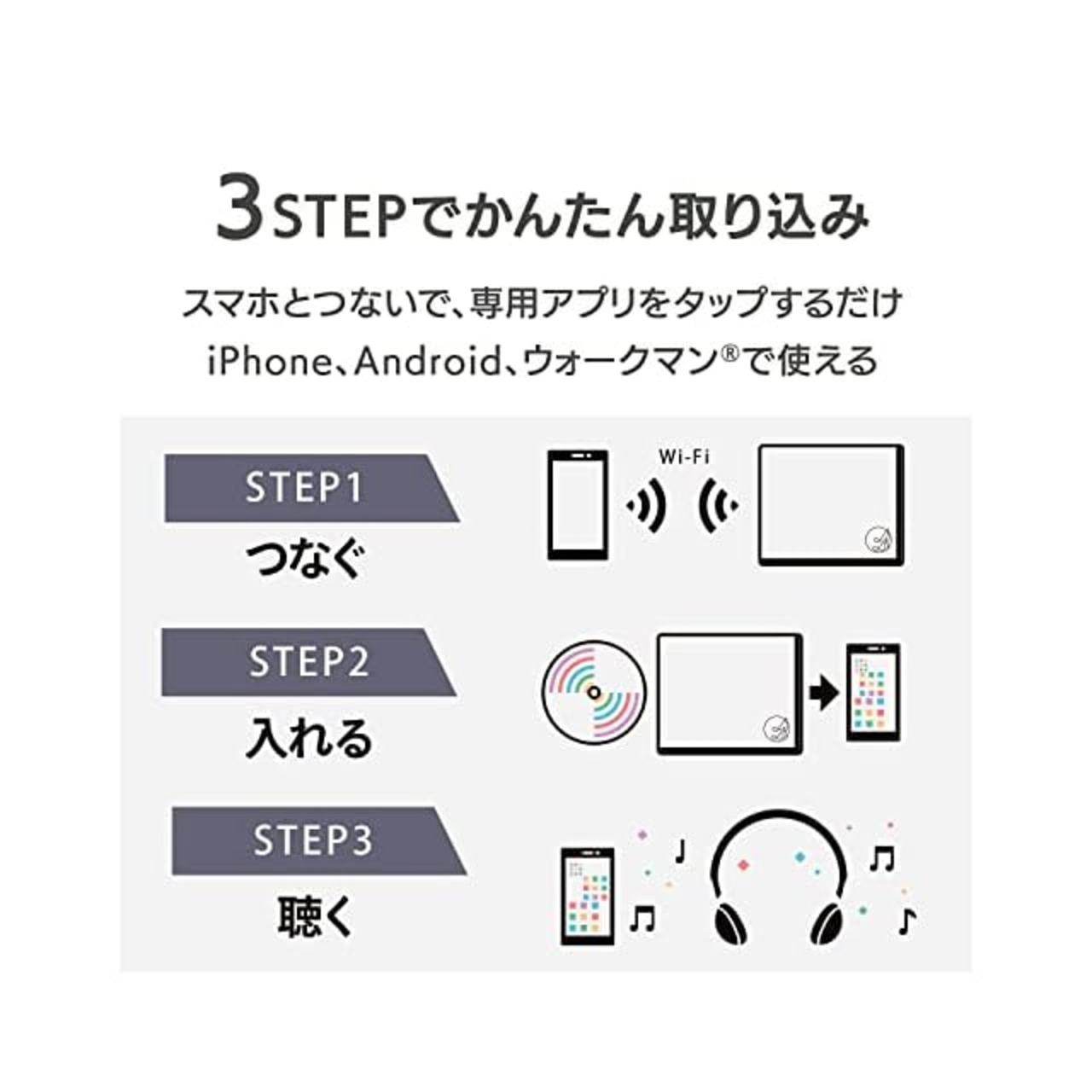 【パソコンなしでCDをスマホに入れて聴くCDレコーダー】「CDレコ6(シックス)」は、お気に入りの音楽CDをスマホに入れて聴けるスマホ用CDレコーダーです。CDレコ6は、スマホとワイヤレスで接続します。専用のアプリ「CDレコミュージック」をインストールし、カンタンな操作でCDを取り込めます。