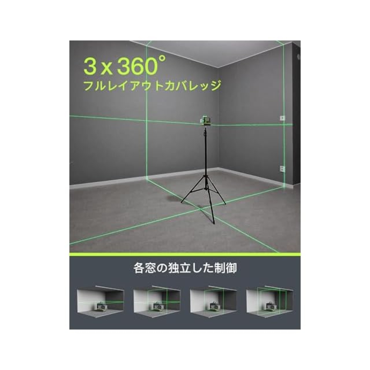 360度×3設計とプロ仕様の回転式スタンドにより、レイアウトを完全にカバーすることができ、あらゆる配置作業に適しています。スタンドは360度どの方向にも回転するため、ユーザーはどの角度からもレーザーをはっきりと確認することができ、部屋全体をカバーすることが可能です