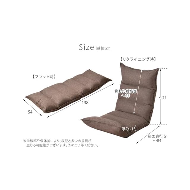 【サイズ】[フラット時] 幅54×奥行138×厚み15cm [リクライニング時] 幅54×奥行84×高さ71cm(※サイズはカバー生地の端まで含めた寸法です。)