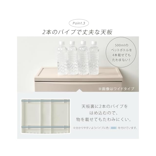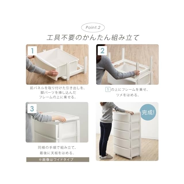 収納目安(引き出し1段あたり)は「Tシャツ:約8枚」または「バスタオル:約2枚」。