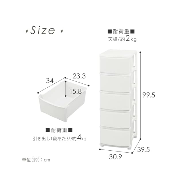 商品内容:奥行39.5cm x 幅30.9cm x 高さ99.5cm (引き出し数 5)