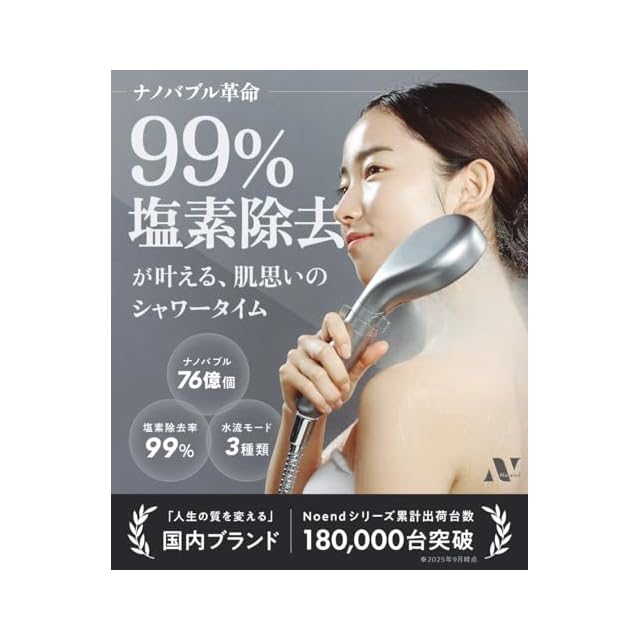 商品名:Noend オーガニックファインバブルシャワーヘッド 【99%塩素除去|マイクロナノバブル76億個】 【浄水|天然素材 活性炭フィルター】 【ミストモード|シルキーバス】 【保湿|スキンケア】 【3つの水流モード|手元止水】 【最大節水率59%|水道代節約】 浄水器協会認証 「MONOQLO」ベストバイ受賞 (活性炭フィルター1本付属 | 塩素チェッカー2包同梱) (国内ブランド) (ブラック)