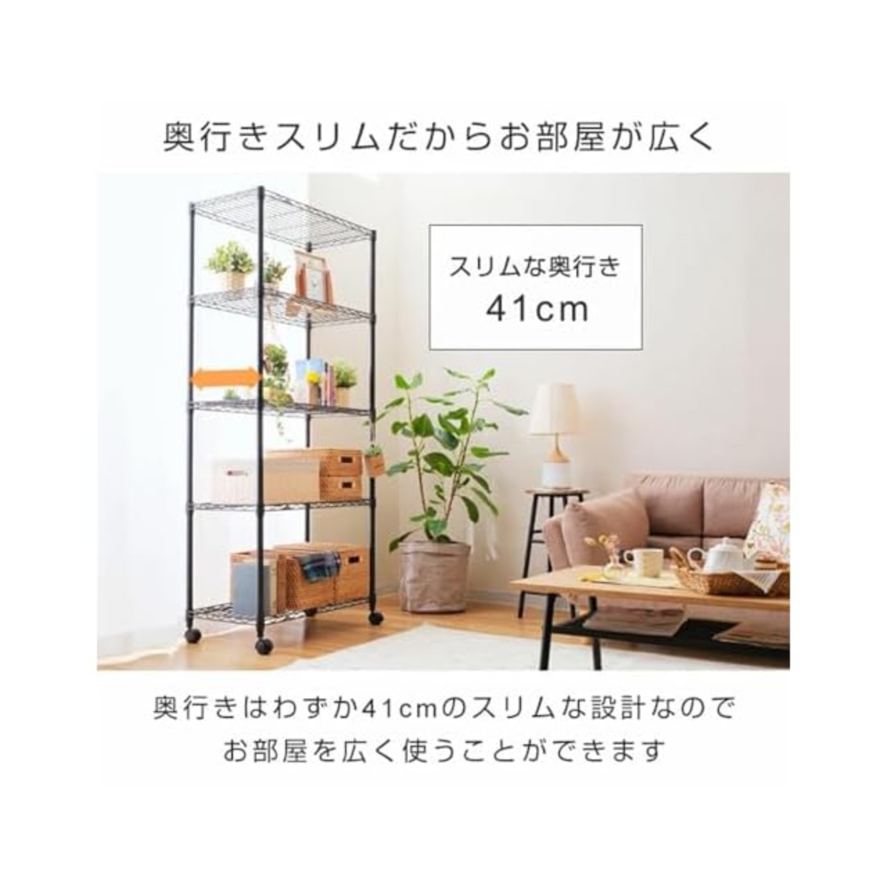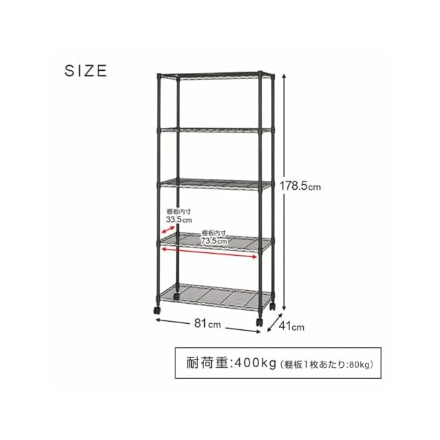 商品名:ドウシシャ ルミナス ノワール ラック 5段 幅80 奥行40 キャスター付き スチールラック 黒 ブラック 収納棚 おしゃれ キッチンラック サビに強い 組立簡単 幅81×奥行41×高178.5cm(キャスター込) ポール径25mm 耐荷重80kg NO8018-5