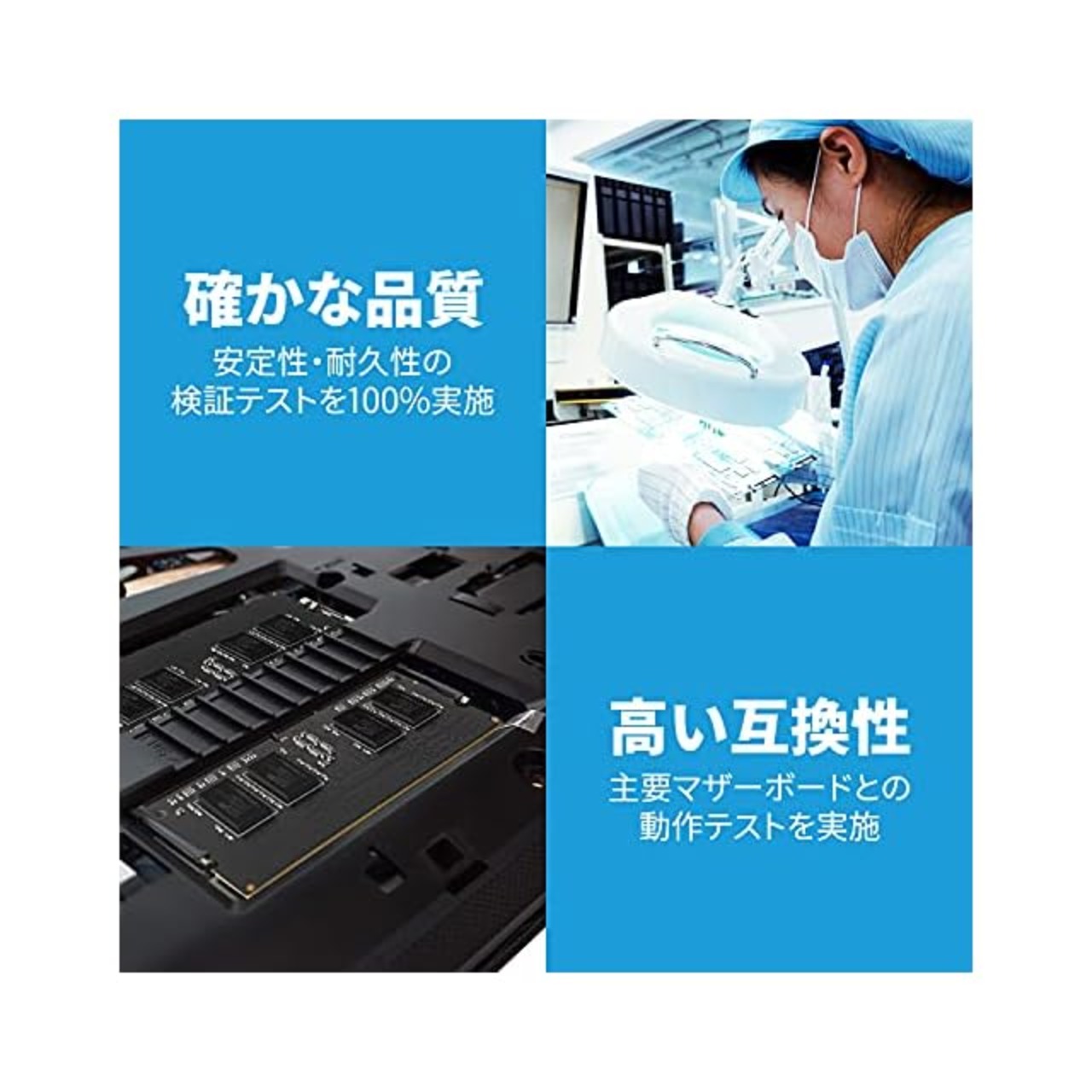 主なDDR4マザーボードでの100%テストを実施。安定性、耐久性、互換性を検証後出荷。
