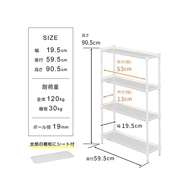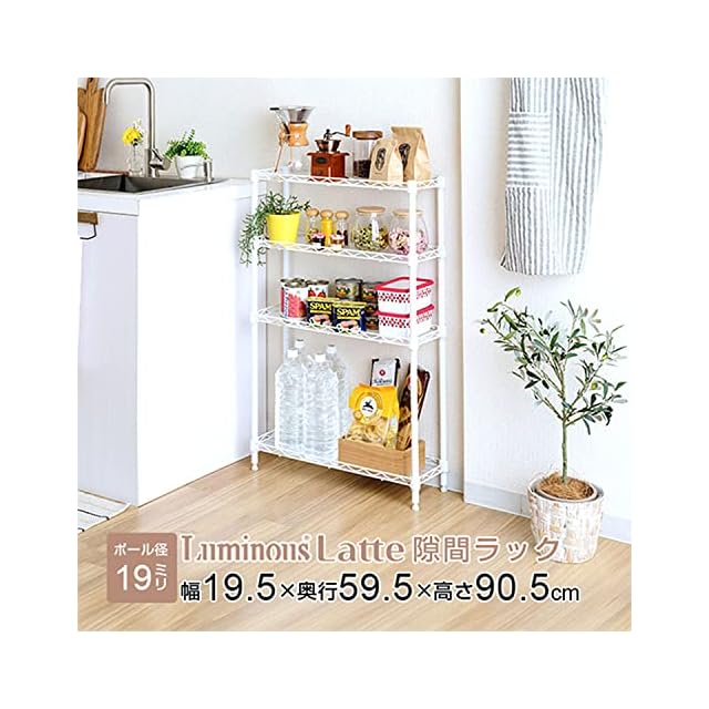商品名:ドウシシャ ルミナス ラテ 隙間収納ラック 幅20cm 奥行60 4段 ホワイト 白 おしゃれで可愛い スリムスチールラック 落下防止シート付き 全体耐荷重120kg 幅19.5×奥行59.5×高さ90.5cm キッチン収納 ポール径19mm LL2060-4WH