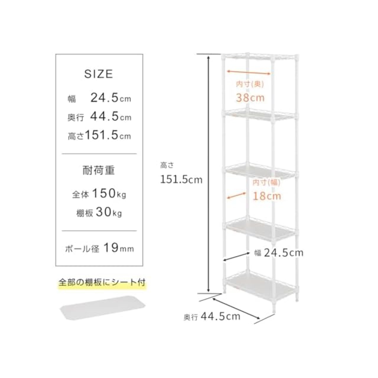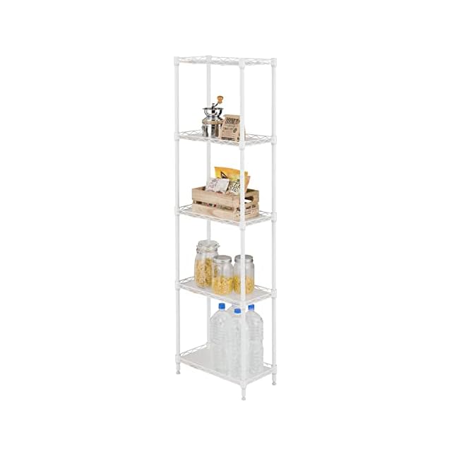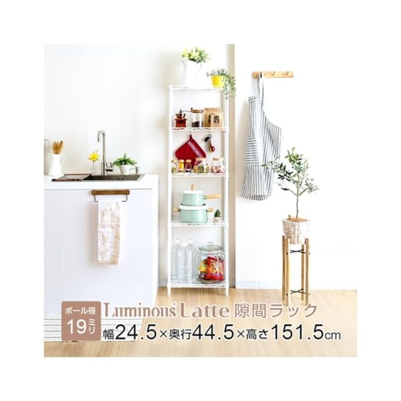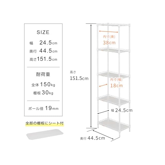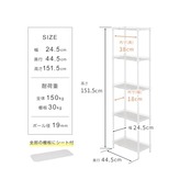 商品名:ドウシシャ ルミナス ラテ 隙間収納ラック 幅25cm 奥行45 5段 ホワイト 白 おしゃれで可愛い スリムスチールラック 落下防止シート付き 全体耐荷重150kg 幅24.5×奥行44.5×高さ151.5cm キッチン収納 ポール径19mm LL2545-5WH