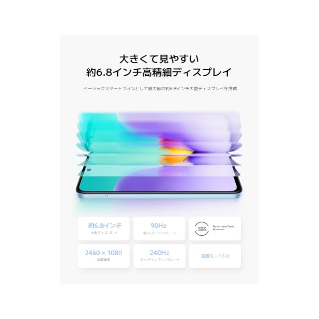 【6.8インチ大型ディスプレイ】約6.8インチ大型ディスプレイを搭載。画面リフレッシュレートは最大90Hzに対応(自動調整)しているため、ゲームやスポーツ中継など激しい動きをなめらかな映像で楽しむことができます。また、SGSのブルーライト低減認証を受けているため、目に優しく、読書モード3.0を併せることで電子書籍やウェブ閲覧など、テキスト中心のコンテンツもより快適に読むことができます。
