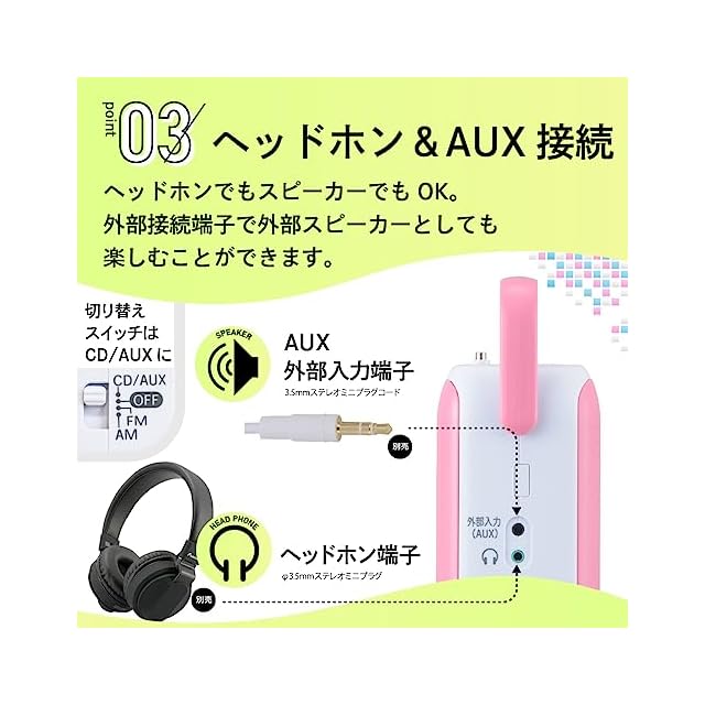 【簡単シンプルな操作】ワンプッシュで背面がオープンし、中にCDをセットするだけで使えるCDプレーヤー。ヘッドホンの出力端子付き、また外部機器を接続し外部スピーカーとしても使用可能(φ3.5mm接続コード別売を使用)電源はコンセントと電池の2電源方式。