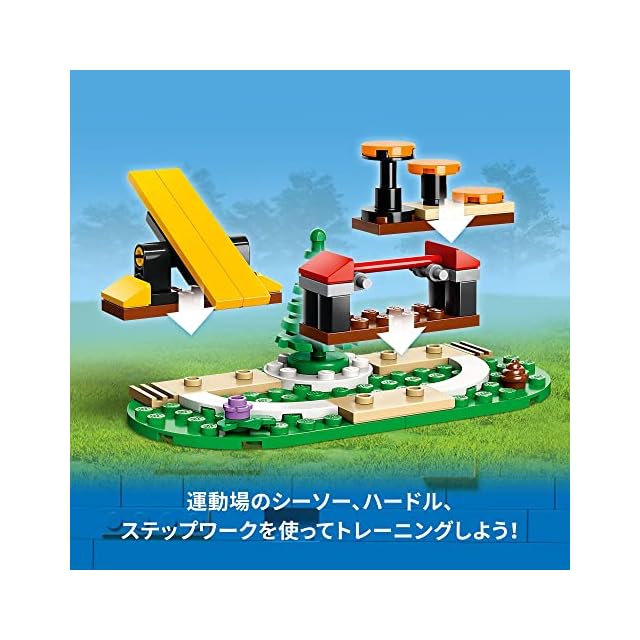 セットの内容 – トレーラー付きSUVと3種類のトレーニング用具、トレーニング場の場面設定の組み立てに必要なパーツのほか、ミニフィギュア2体、イヌのどうぶつフィギュアが付属しています。